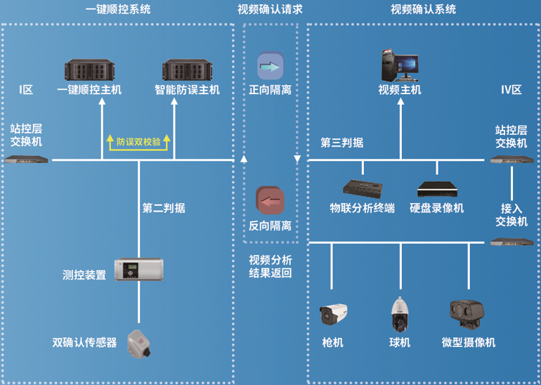 本方案在双确认传感器方式基础上增加了视频确认系统,系统由安装在隔离开关处的有线摄像机和物联分析终端组成。 倒闸操作时由一键顺控主机向视频确认系统发出联动信号,视频确认系统收到联动信号后触发摄像机采集隔离开关位置图像,并通过物联分析终端将智能识别结果传送到站控层网络,实现了视频第三确认。 双确认传感器方式作为第二判据,视频确认方式作为第三判据,将一键顺控与视频确认系统紧密结合,进一步完善设备状态监测,确保一键顺控操作的安全可靠。
