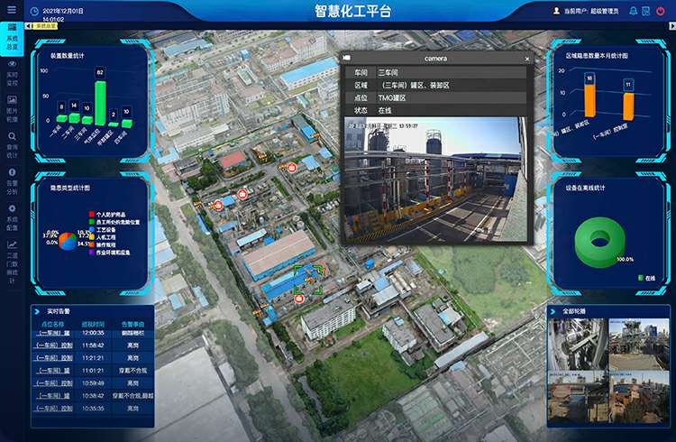 AI 算法智能分析覆盖化工厂全场景,实时轮播、即时分析、分级告警、多端推送、流程化处理等实现隐患告警的全周期管控